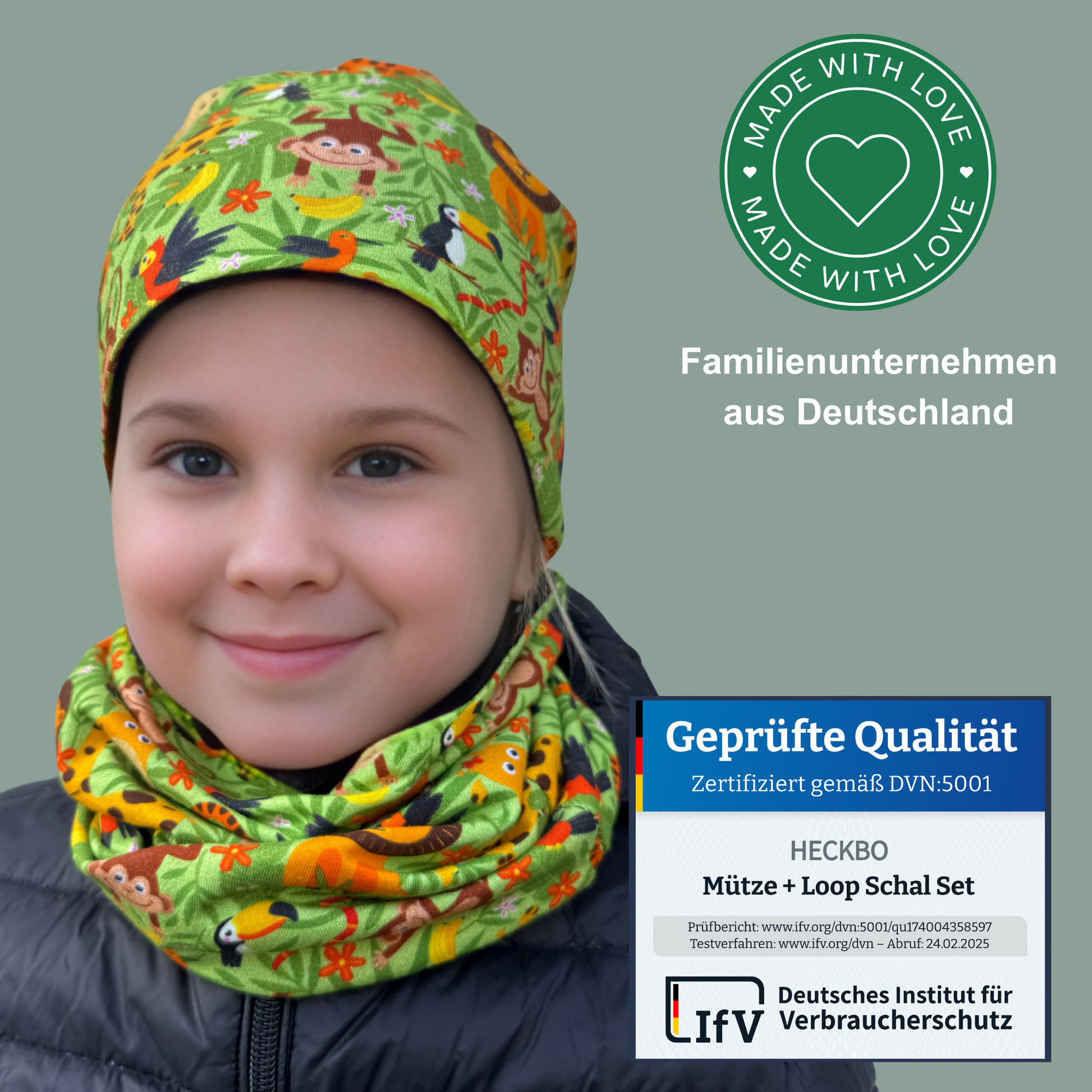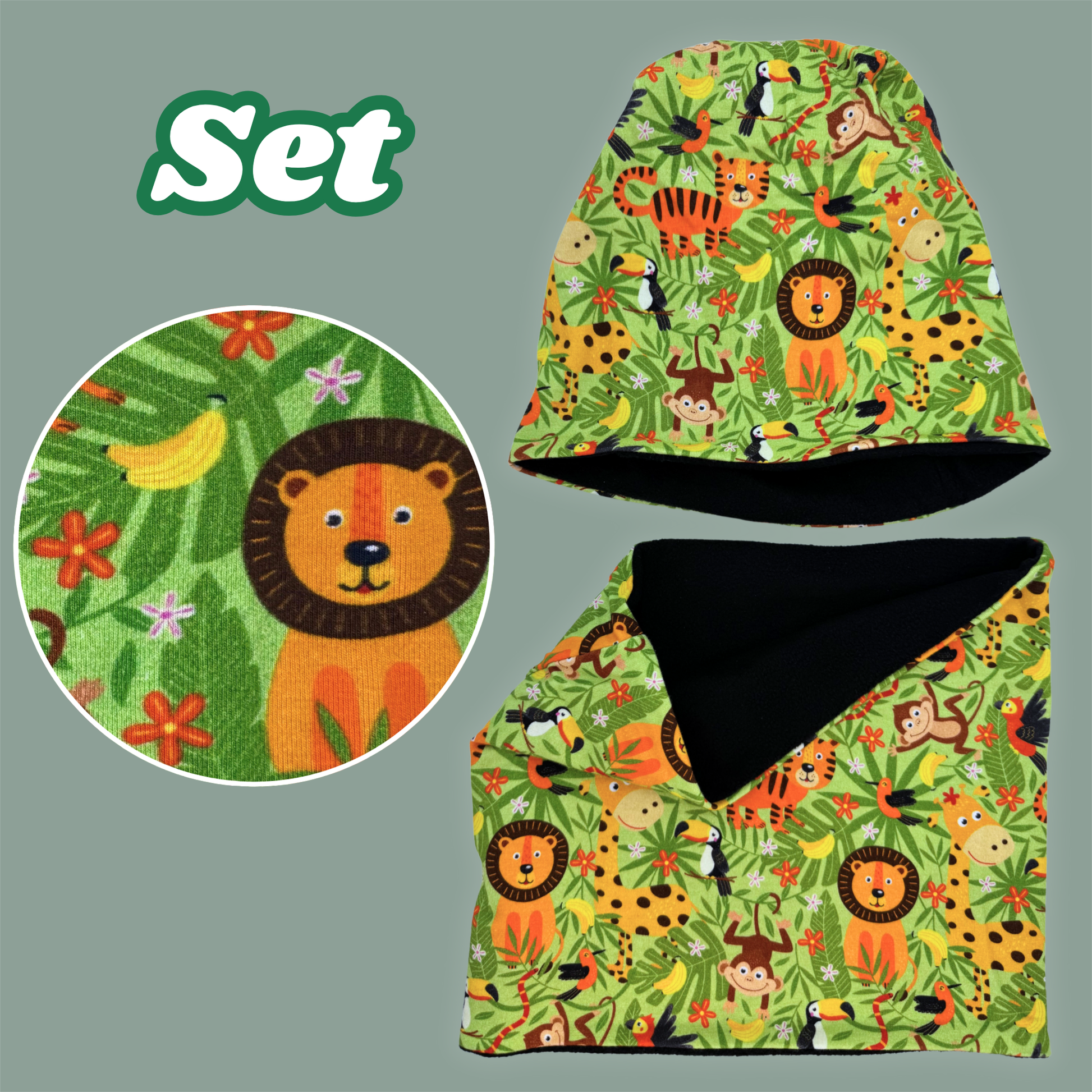 🌴 Bereit für kleine Expeditionen – das HECKBO Beanie & Loop Schal Set im Dschungel-Design