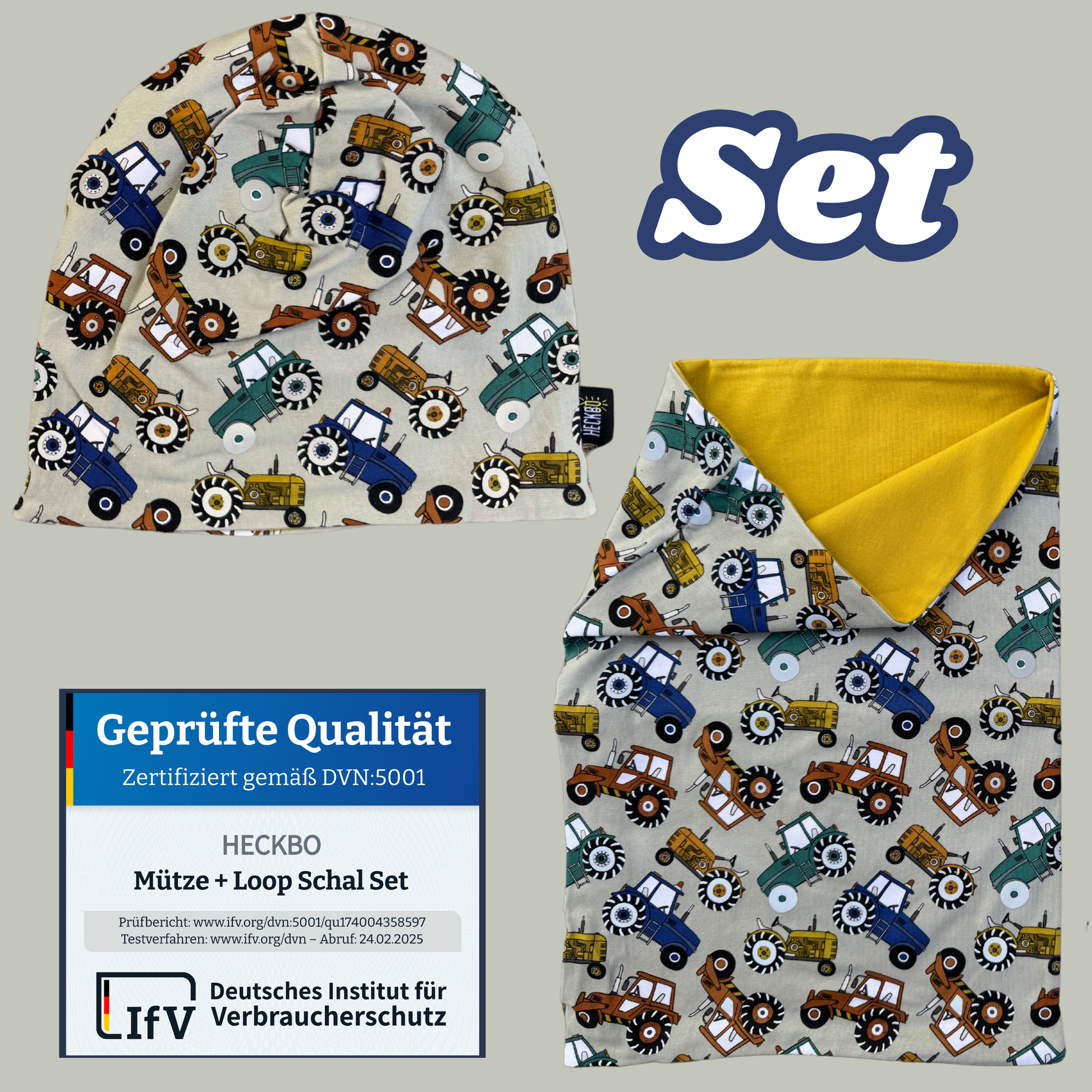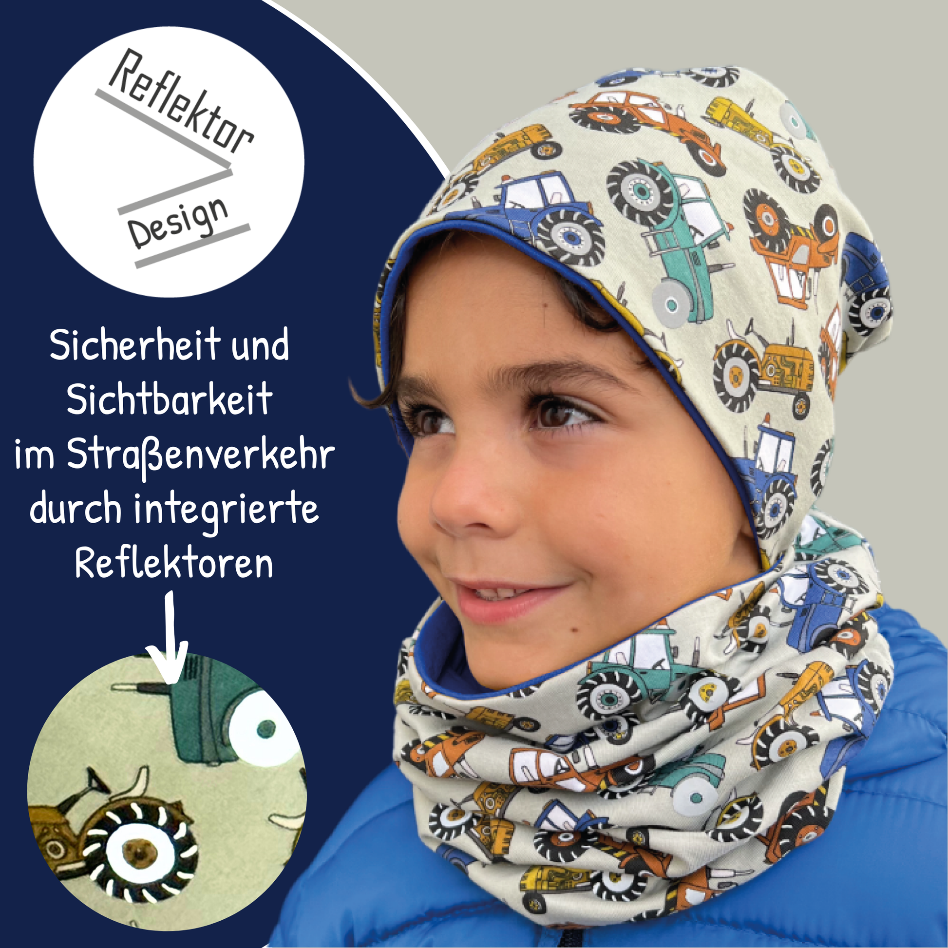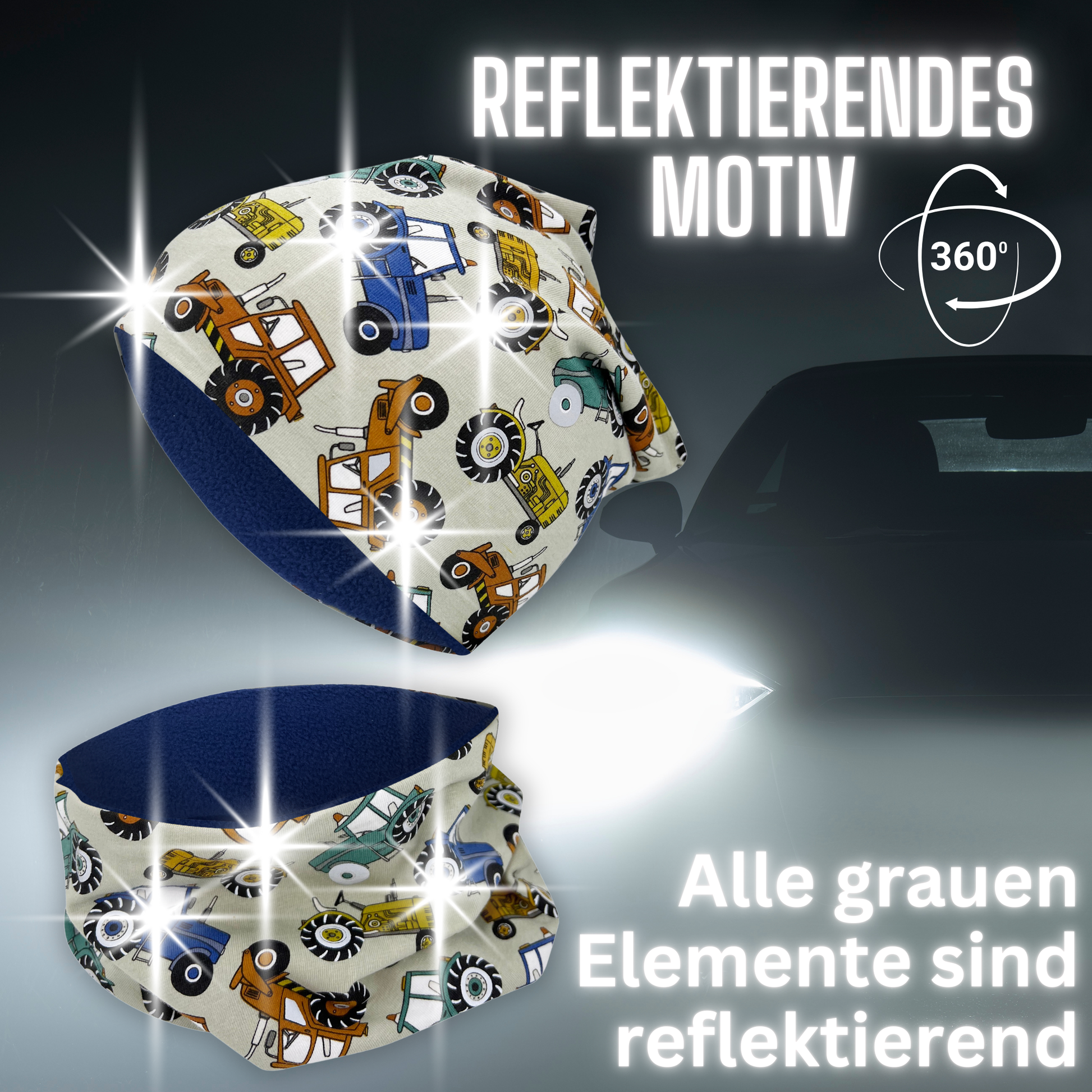 🚜 Mütze & Schal im Set – mit reflektierendem Traktor-Motiv