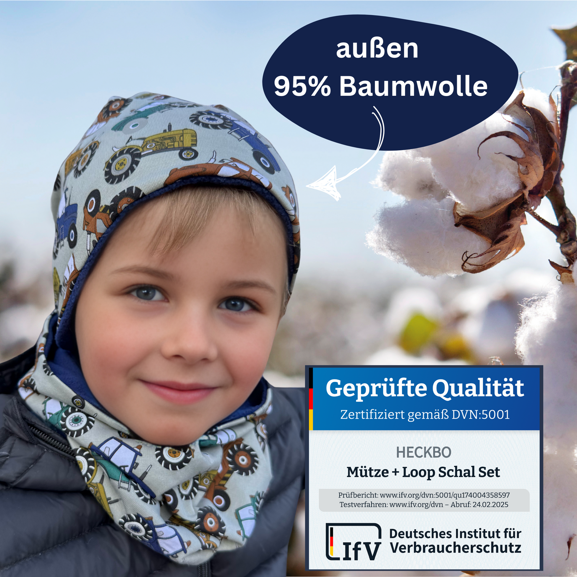 Das coole HECKBO Traktor-Set aus Beanie-Mütze und Loop-Schal ist das perfekte Accessoire für kleine Fahrzeug-Fans. Das liebevoll gestaltete Bauernhof-Motiv mit silbernen Reflektoren an Reifen, Felgen und Fenstern sorgt nicht nur für strahlende Kinderaugen, sondern auch für mehr Sicherheit im Alltag. Dank doppellagiger Verarbeitung und elastischem Baumwollmaterial ist das Set bequem, warm und praktisch – in zwei Varianten erhältlich: mit leichtem Jersey-Futter für die Übergangszeit oder mit kuscheligem Vlies für den Winter.