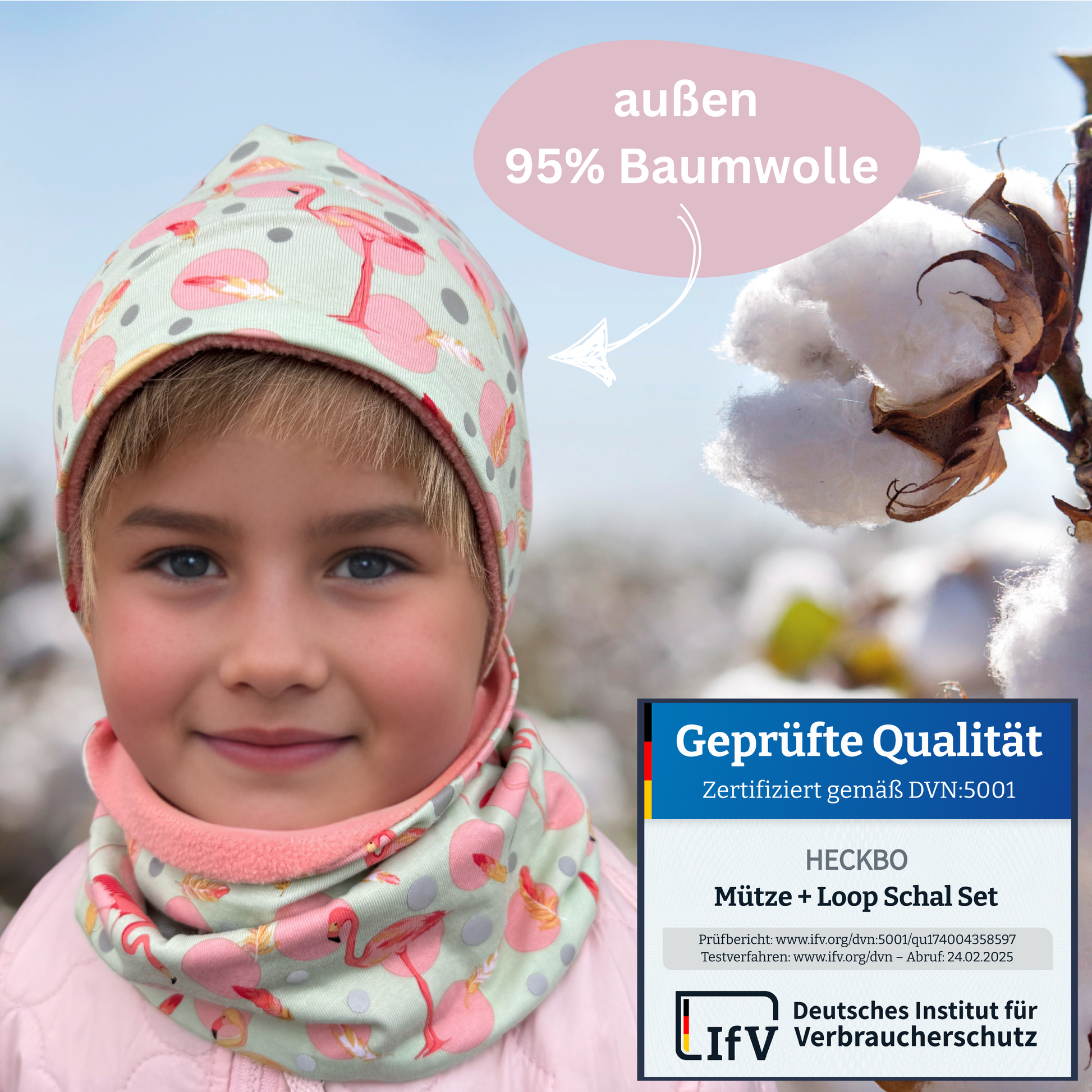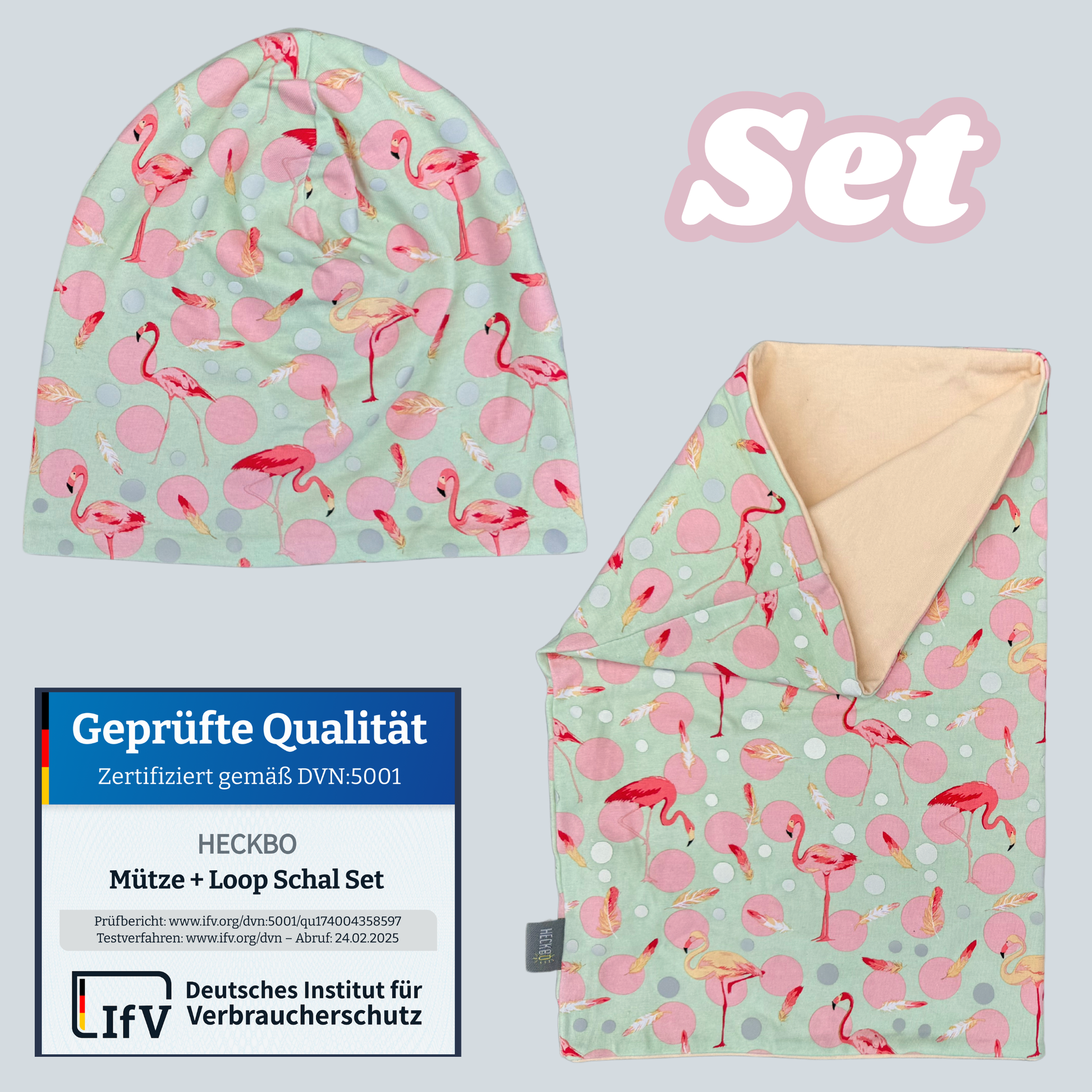 Dieses liebevoll gestaltete HECKBO Set besteht aus einer weichen Beanie-Mütze und einem farblich passenden Loop-Schal mit süßem Flamingo-Print. Reflektierende Elemente sorgen für bessere Sichtbarkeit im Straßenverkehr – und ein stylisches Extra im Alltag. Erhältlich in zwei Varianten: mit leichtem Jersey-Stoff für die Übergangszeit oder mit wärmendem Vlies für kalte Wintertage.