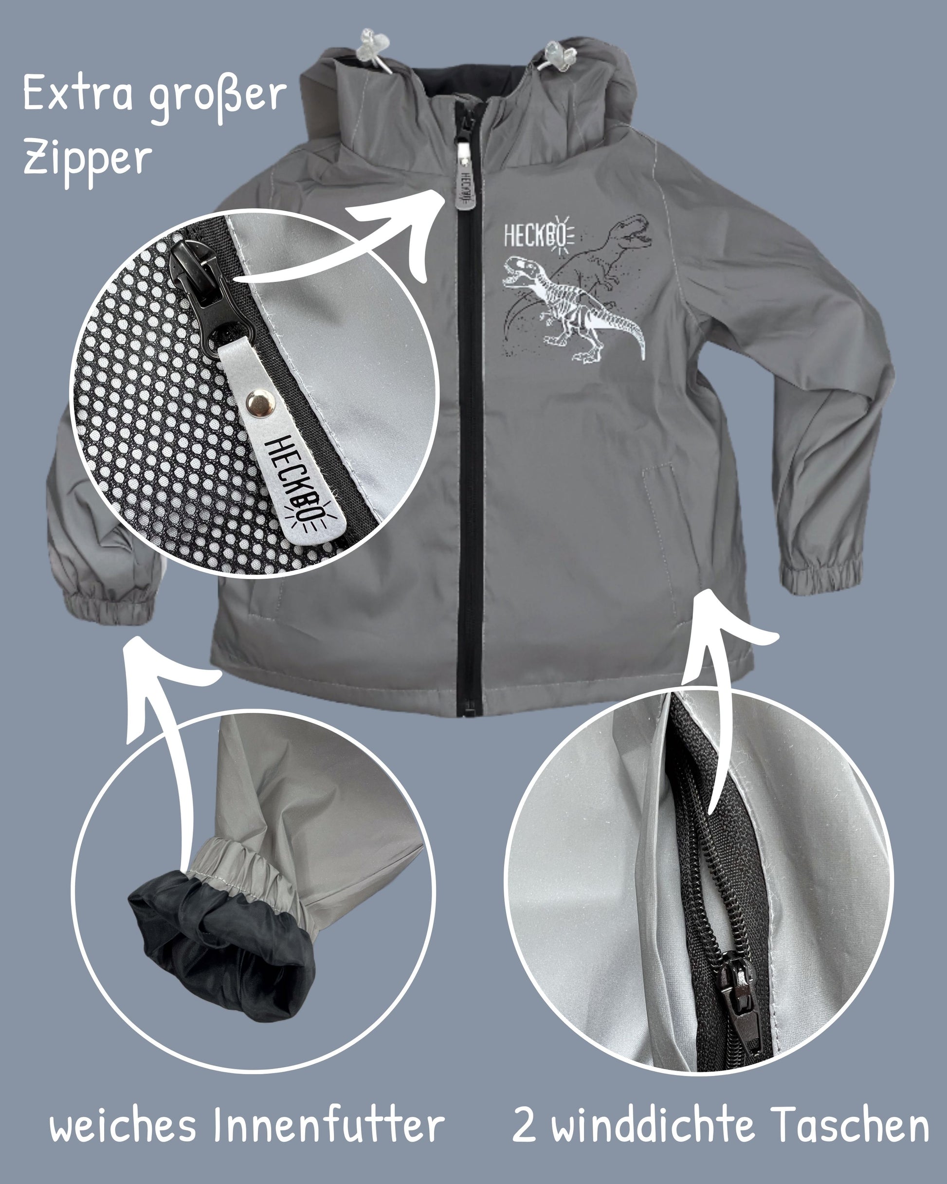 Die reflektierende HECKBO Dinosaurier Jacke ist in verschiedenen Größen erhältlich und bietet Sicherheit und Style für kleine Entdecker.