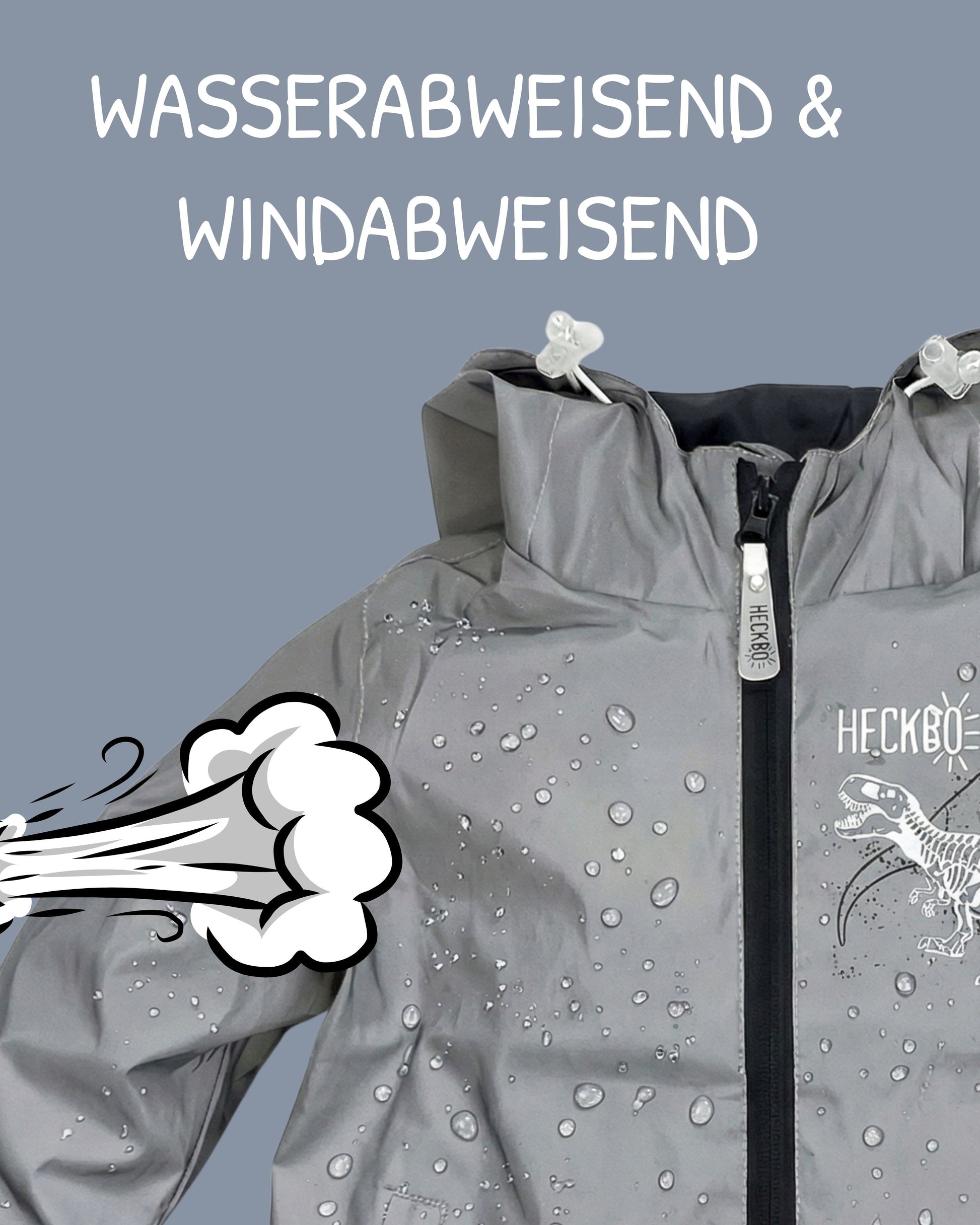 🦕 DESIGN: Stylische HECKBO Wind- und Regenjacke mit coolem Dinosaurier-Motiv auf Brust und Rücken – ein echter Hingucker für kleine Dino-Fans.