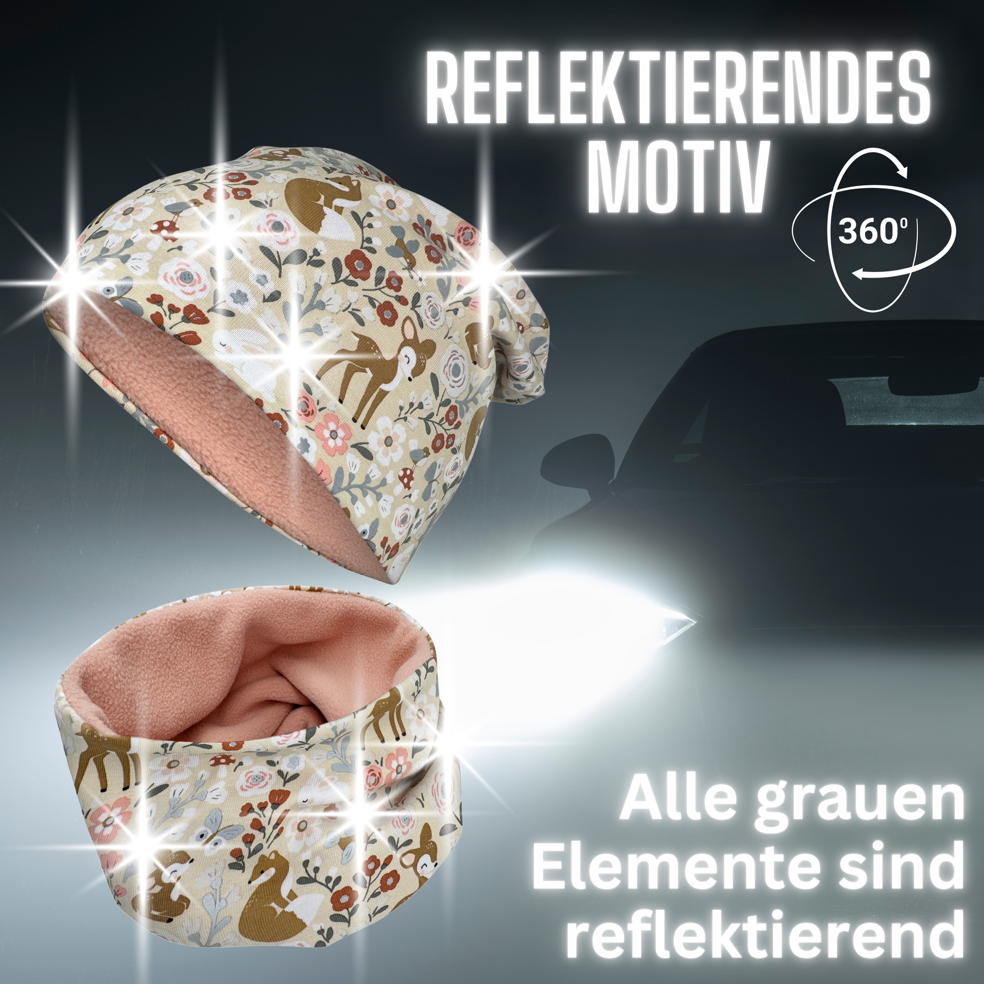 Das zweiteilige HECKBO Set besteht aus einer weichen Mütze und einem farblich passenden Loop-Schal mit zauberhaftem Waldtiere-Motiv. Reflektierende Details sorgen für einen stylischen Look und mehr Sicherheit im Alltag.